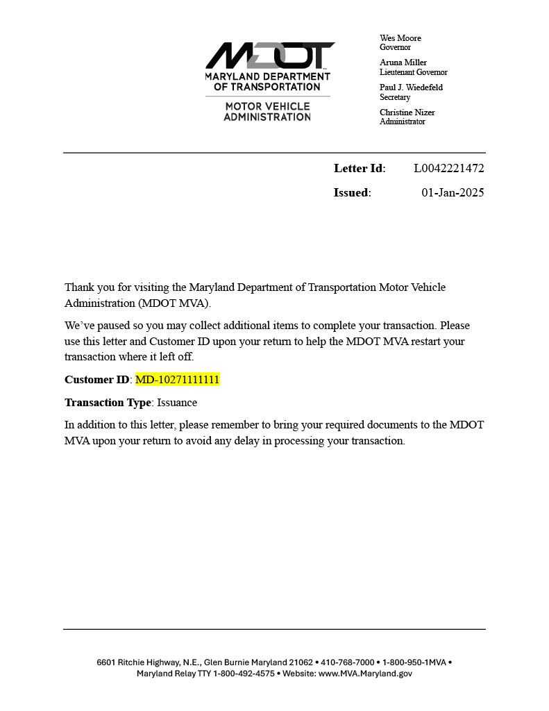 - Previous MVA Visit - If you have previously visited the MVA and submitted all required documents, the MVA employee may have created a Customer ID number. It would be found on paperwork they gave you. We cannot use censored numbers like MD-********405.