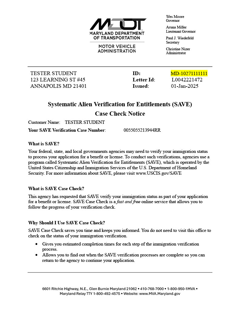 A Maryland Customer Identifier number is a number created by the Maryland MVA that allows MVA employees to find you in their system. The number usually starts with MD-1027. Below is a list of sources of where you can find your Maryland Customer ID number if you have one.